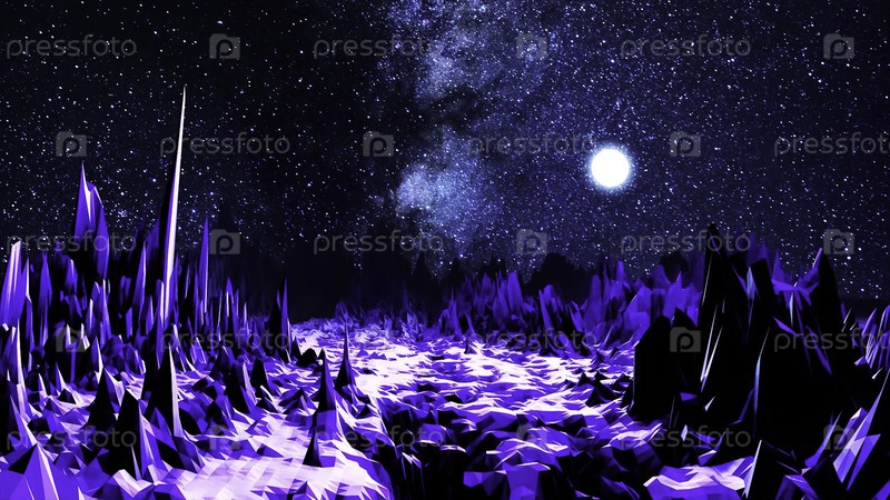 Абстрактная долина в неоновом свете. анимация. компьютерное пространство с долиной острых валунов, освещенных ярким лунным светом