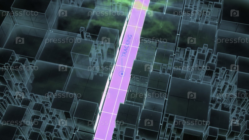 Эффект наблюдения в анимации.Дизайн.Зеленая дорога, состоящая из больших квадратов с движущейся точкой на фиолетовой дороге