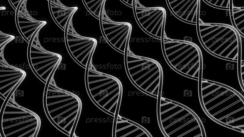 Абстрактный монохромный научный фон с спиралами ДНК. Дизайн. Движение структур ДНК на черном фоне