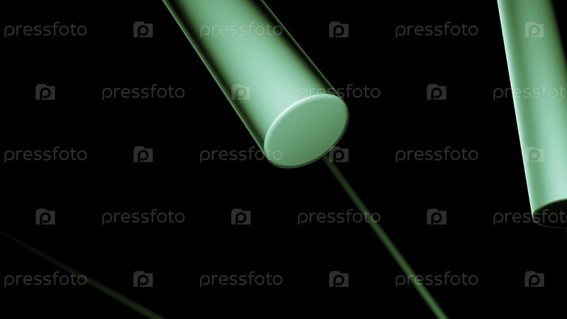 Абстрактные лучи и летающие трубы на черном фоне. Дизайн. Красочные узкие лучи становятся трубами