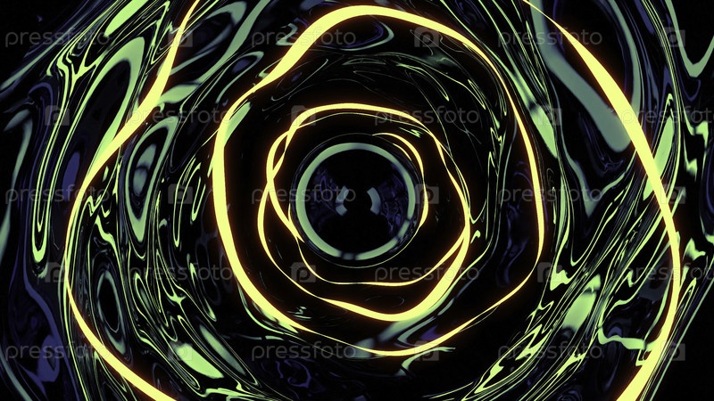 Туннель с жидкими стенами и отражением. Дизайн. Жидкостное зеркало 3D-тунел с неоновыми линиями. Линии света, отражающиеся в жидком туннеле