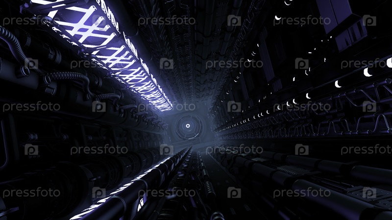 3D вид изнутри Международной космической станции.Движение.Полёт внутрь Внутренняя часть космического корабля, узкий коридор космического модуля