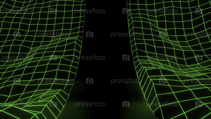 Перемещение изогнутого пространства с помощью компьютерных сеток. Дизайн. Слайд с неоновой ретро-сеткой в киберпространстве. Гонка на гоночной дороге со стеклянной и стеной