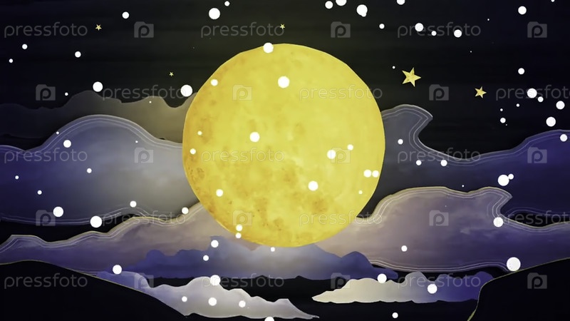 Анимация мультфильмов с снежными пустынями и падающими снежинками.Сцена.Рука снимает полную луну, красивая сказка