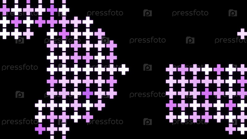 Абстрактный мозаичный фиолетовый рисунок на черном фоне. Дизайн. Движущиеся крестообразные плитки, случайным образом движущиеся облака