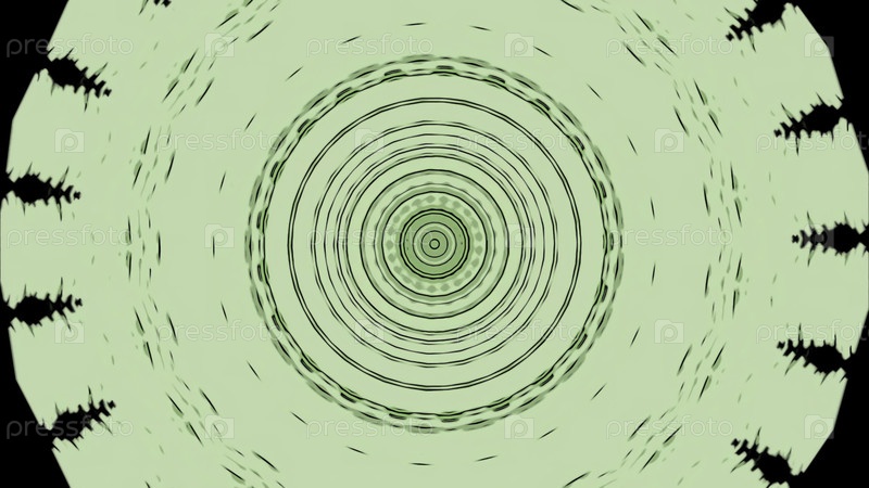 Пульсирующий круглый рисунок со светящимися кольцами. Дизайн. Ритмические пульсации круглого рисунка на черном фоне. Круги с кольцами пульсируют в музыкальном ритме