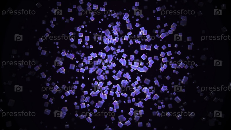 Компьютерный генерируемый абстрактный фон, 3D-рендеринг фона. Анимация. Абстрактная анимация небольших неоновых многоцветных трехмерных частиц, плавающих медленно на черном фоне