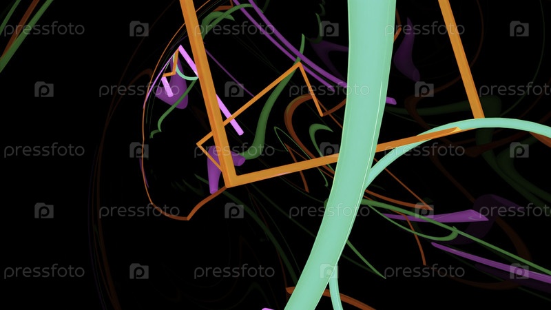 Черный фон с многоцветными крутящимися полосами. Дизайн. Яркие линии, создающие различные узоры развиваются словно на ветре в абстракции. Высокое качество 4k кадров