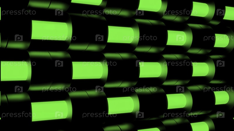Абстрактная стена с движущимися элементами вдоль освещенных труб. Дизайн. Промышленный фон со стеной параллельных горизонтальных ламп