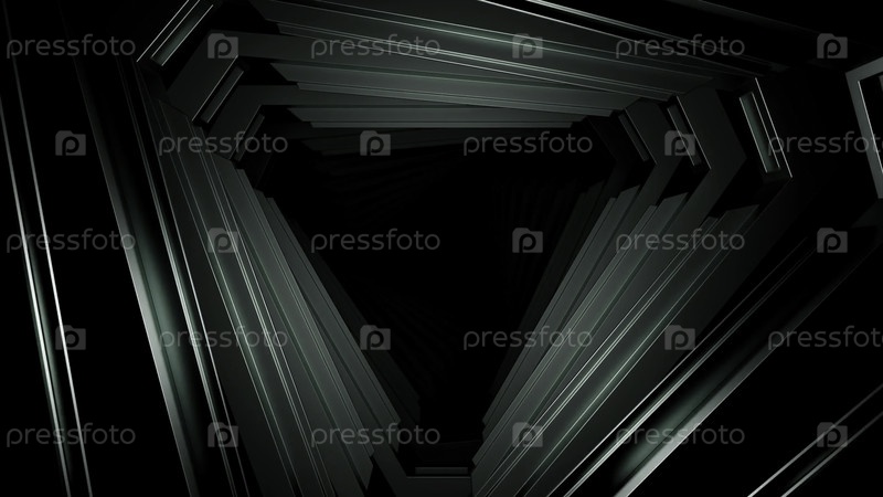 Вход в монохромный треугольный космический туннель.Движение. 3D движущийся черно-белый коридор