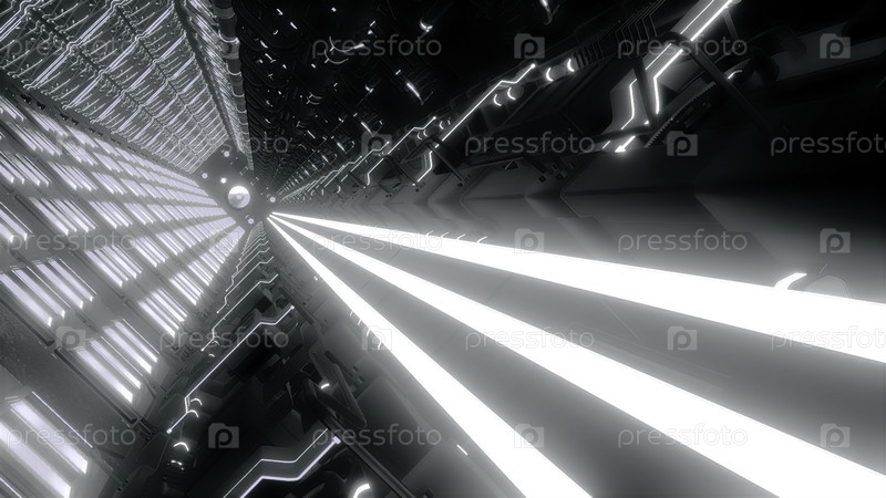 Технологический тоннель с неоновыми линиями и трубами. Движение. Футуристическое 3D-пространство со светящимися линиями и технологиями. Космический туннель с неонными линиями. Киберпанк
