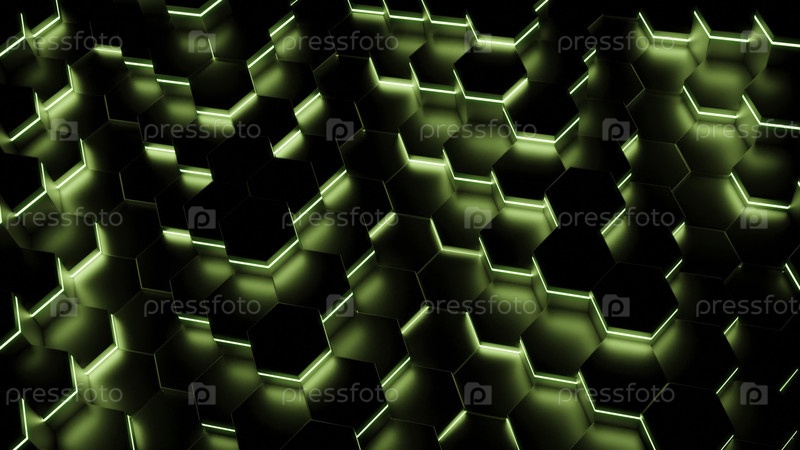 Неонные шестиугольники передвигаются волнами в темноте. Дизайн. Шестиугольники, движущиеся волнами с флуоресцентным освещением в темноте. Черные неоновые шестоугольники перемещаются волнами в фоновой анимации