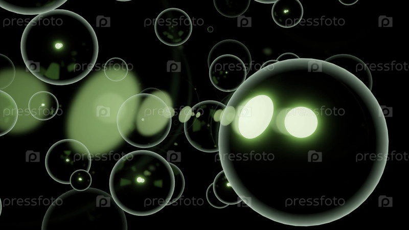 Мыльные пузыри, плавающие на черном фоне. Дизайн. Сферические силуэты одного размера, летящие в одном направлении