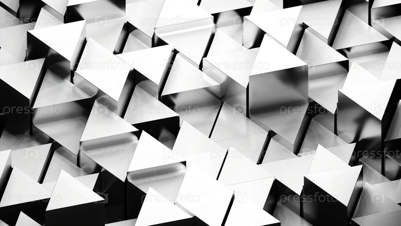 Металлические треугольники перемещаются по поверхности. Дизайн. Анимация фона с движущимися 3D-треугольниками. Динамическое движение треугольников на металлической поверхности