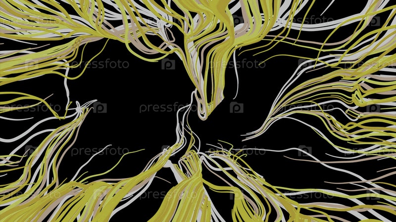 Желтые и белые щупальца, движущиеся от центра экрана во все стороны на черном фоне. Дизайн. Красочные волнистые струны