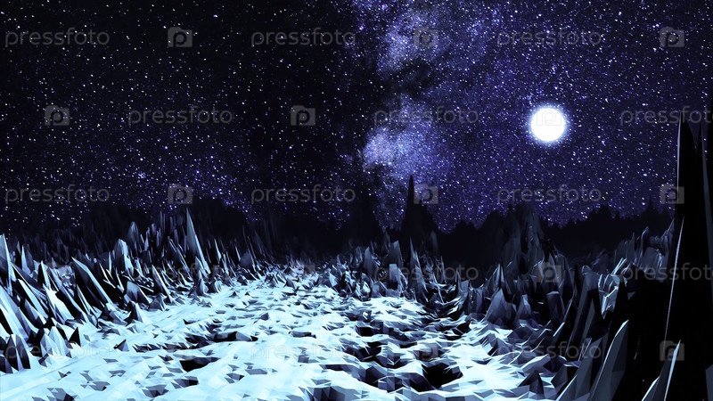 Абстрактная долина в неоновом свете. анимация. компьютерное пространство с долиной острых валунов, освещенных ярким лунным светом