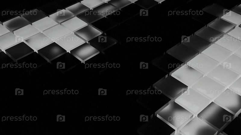 Поверхности с движущимися мигающими квадратами на черном фоне. Дизайн. Светящиеся музыкальные кнопки перемещаются в темноте. Мигающие квадратные кнопки свечутся и двигаются по поверхности