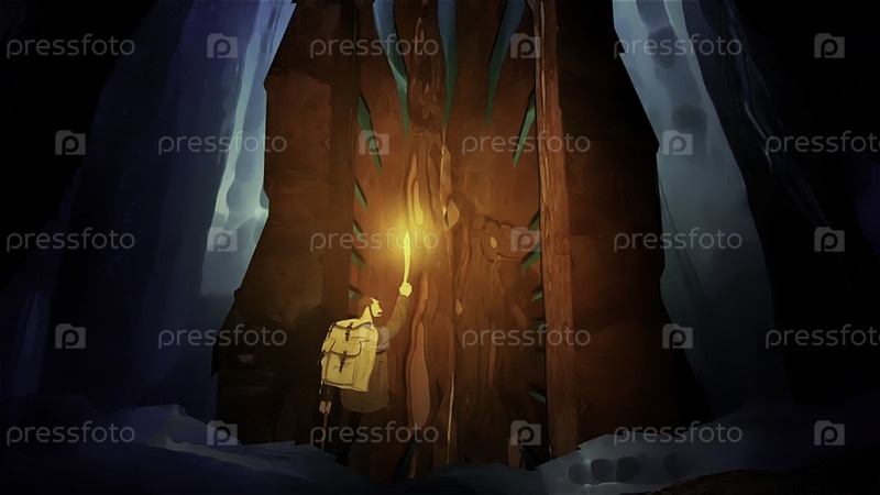 Абстрактная мультфильмовая анимация с храбрым человеком с факелом в лесу.Сцена.Человек, проходящий через препятствия в опасном лесу