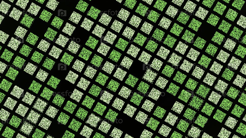 Фон квадратов, медленно движущихся на черном фоне. Анимация. Зеленые квадраты в стиле матрицы перемещаются по течению на черном фоне. Анимированная мозаика зеленых квадратов