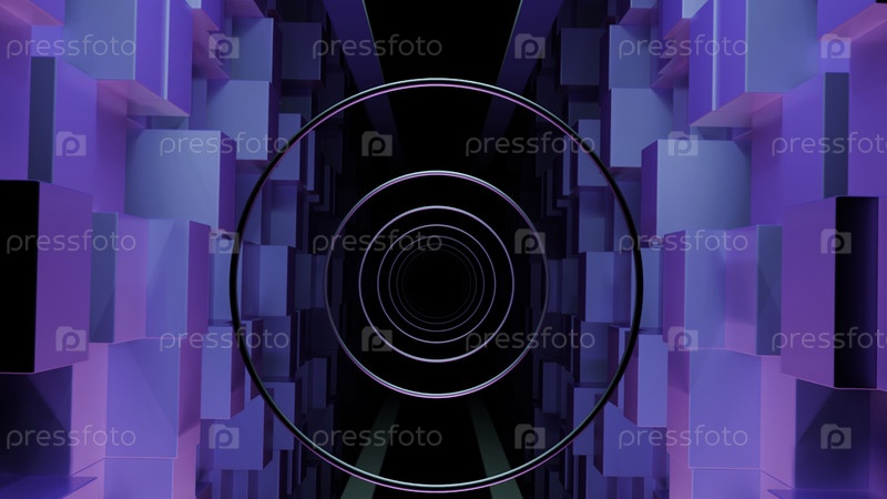 Цифровой фон туннеля с концентрическими кольцами и светящимися синими и фиолетовыми кибернетическими кубиками