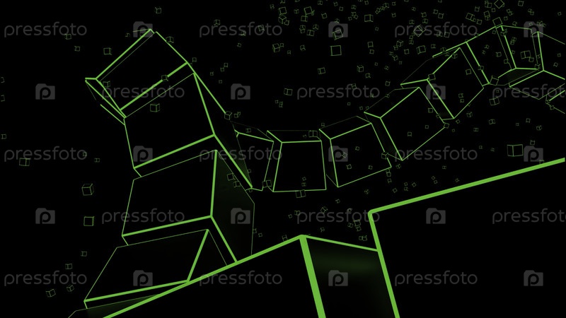 Витящийся ряд красочных 3D кубических силуэтов изолированный на черном фоне, бесшовная петля. Дизайн. Неоновые цветные вращающиеся ряды куба