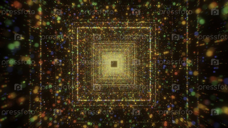 Коридор из ярких квадратов.Движение.Черные кадры, на которых яркие квадраты движутся вперед вокруг ярких маленьких частиц