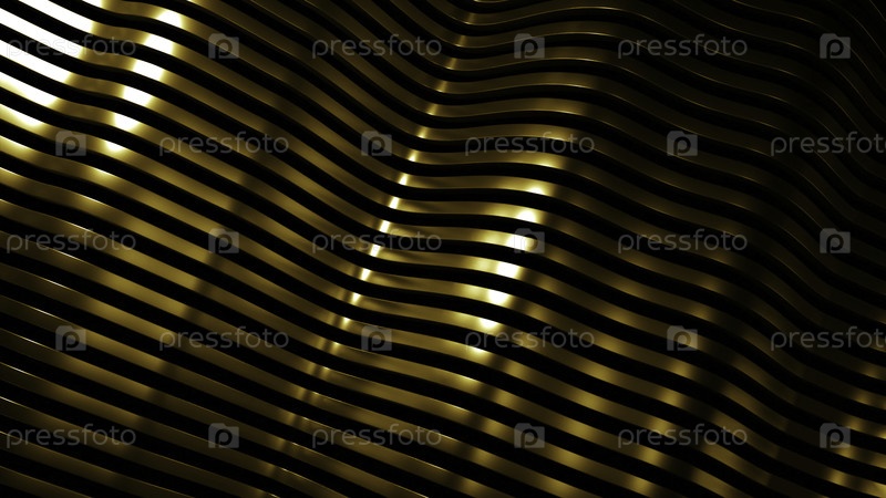 3D-фон с изогнутыми полосами металлических линий. Дизайн. Красивые металлические полосы изгибаются в волнах на черном фоне. Металлические линии медленно движутся, согнувшись