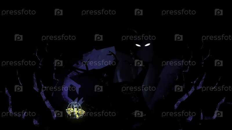 Мультфильм "Таинственный лес и силуэт призрака среди деревьев".Сцена.Золотая птица, запертая в клетке