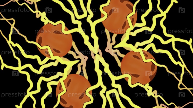 Абстрактные энергетические ядра на черном фоне, окруженные колеблющимися линиями. Дизайн. Энергетическая сфера и волнистые полосы