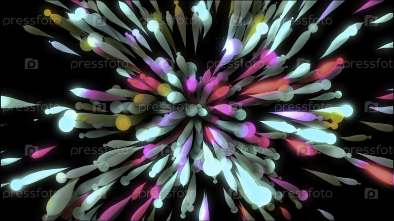 Взрыв цветных 3D-частиц в праздничном стиле. Движение. Цветовые шары с частицами, перемещающимися во время праздничного взрыва. Красочный взрыв с потоком движущихся частиц и 3D-шарами