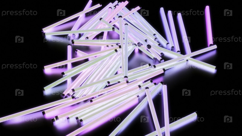Неонные 3d ночные клубы лампы. дизайн. яркие светящиеся светильники на черной поверхности. светящиеся лампы падают в кучу на поверхность