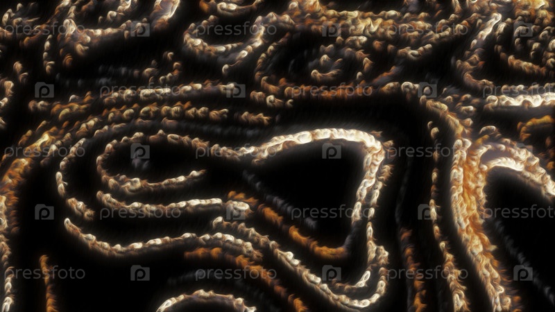 Абстрактные изгибающие узкие полосы крошечных светящихся частиц на черном фоне.Движение.Изогнутые силуэты сияющей пыли