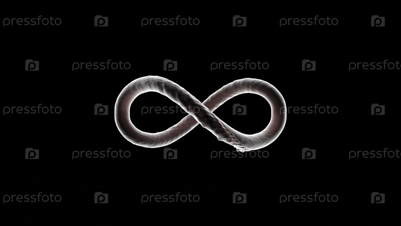Движущийся знак бесконечности на черном фоне. Дизайн. Рыбовидные края 3D-двигающихся спиралей в форме бесконечности. Круглая бесконечная спирала со шкалой
