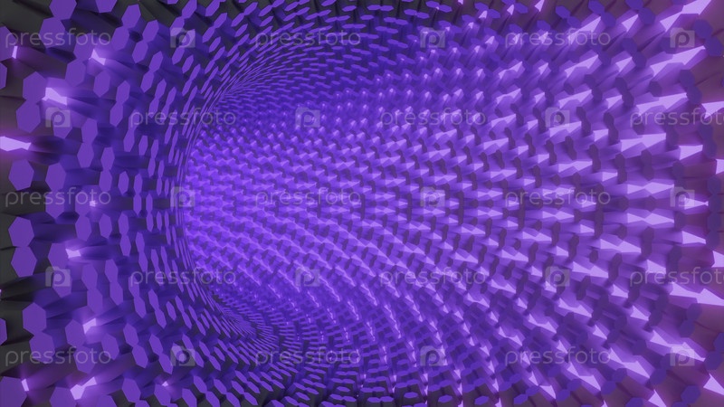 Движущийся изогнутый туннель с неоновыми точками. Дизайн. Красочный тоннель с изменяющимися цветами градиента. Тоннель поворачивается и меняет цвет