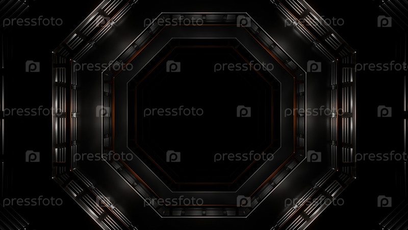 Футуристический тоннель с флуоресцентными огнями. Дизайн. Научно-фантастический интерьерный коридор с неоновым освещением в шестиугольных формах