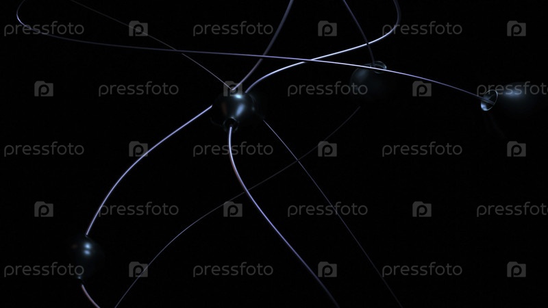 Загнутые вертикальные линии с движущимися шарами. Дизайн. Металлические спиральные линии с движущимися шарами на черном фоне. Шары нисходят вдоль изогнутых линий