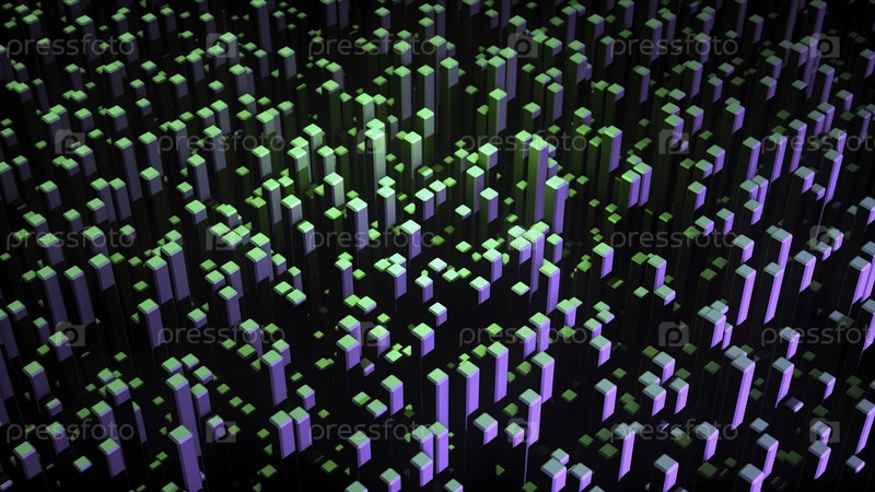 Абстрактная 3D-анимация с восходящими цветовыми квадратами. Анимация. Свертываемые вверх 3D прямоугольные блоки с красивыми многоцветными огнями