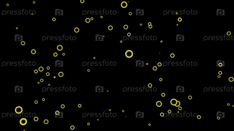Мыльные пузыри, летящие на черном фоне. Дизайн. Красочные кольцевые силуэты