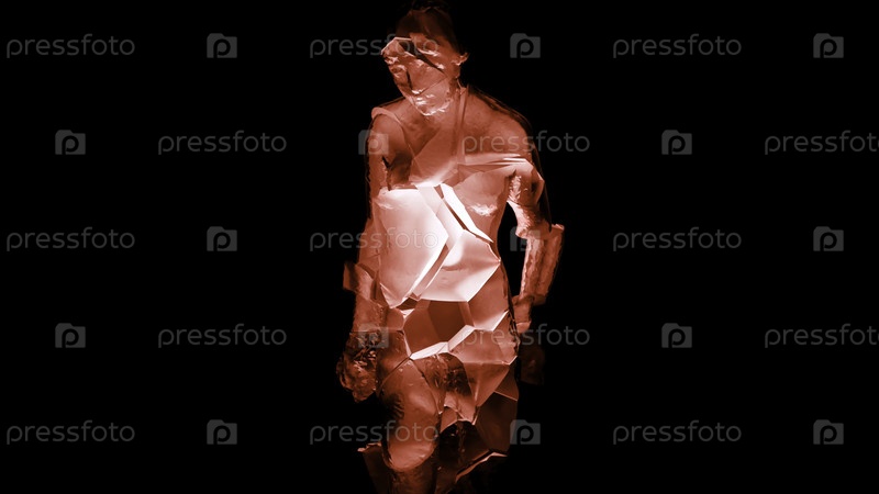 Статуетка мужчины. Дизайн. Светящаяся фигура человека на черном фоне. Стеклянная геометрическая фигура человека со светом. Статуэтка человека вращается и светится на черном фоне