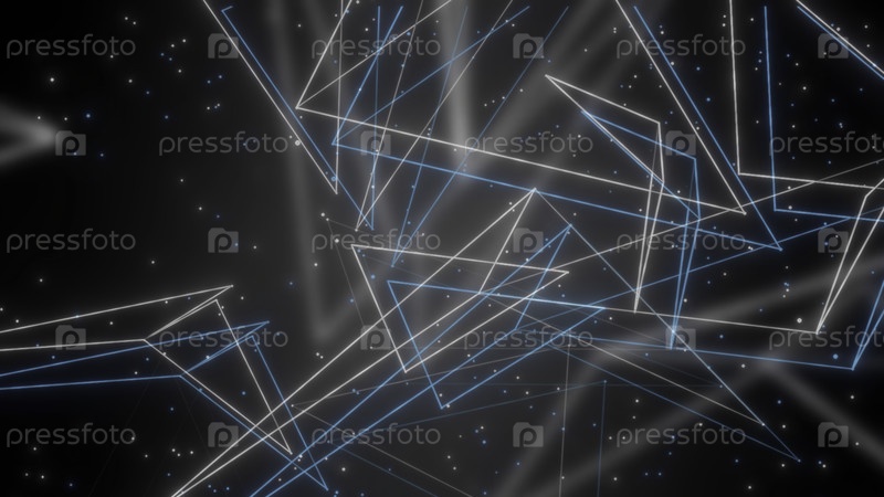 Серый фон.Движение.Летучие бело-синие линии, соединенные друг с другом в абстракции и светящиеся звезды вокруг