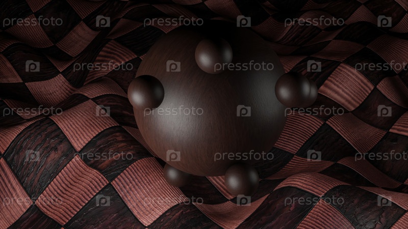 Полушарик в абстракции. Дизайн. Мяч в 3D формате, вокруг которого вращаются другие маленькие шары на красном полотенце с черными узорами