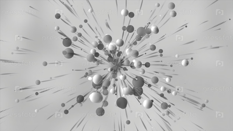 Белый фон.Движение.Маленькие объемные серые и белые круги в анимации рассеиваются в разных направлениях в абстракции.Высокое качество 4k кадров