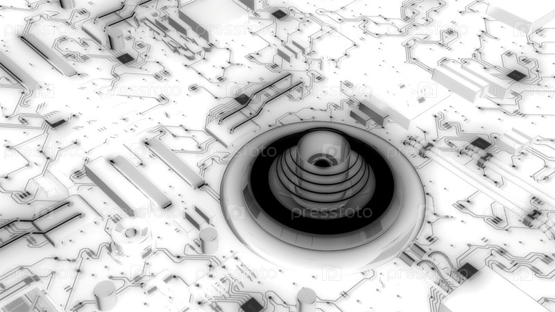 3D-поверхность компьютерной схемы. Дизайн. Анимированная диаграмма материнской платы компьютера с подробностями. Линии и точки на компьютерной схеме чипа на белом фоне