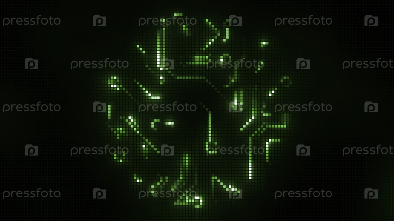 Абстрактные бегущие зеленые неоновые сигналы, похожие на изгибающиеся линии внутри круглой формы. Движение. Светящаяся зеленая плата