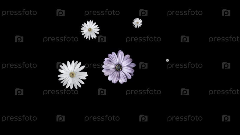 Анимация букета белых маргариток, движущихся вокруг и образующих круг с большим фиолетовым цветом в центре. черный фон