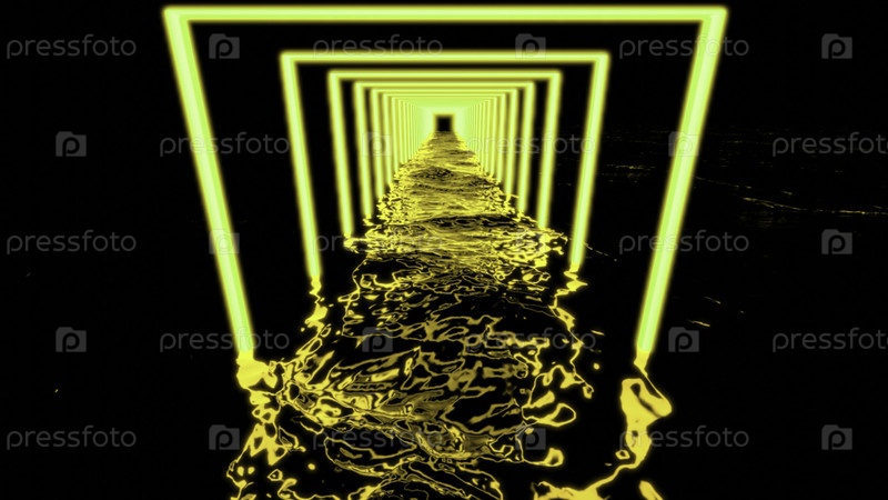 Неон 3d туннель с водой. дизайн. квадратный неон тоннель с водой в темноте. пугающий тоннель со светящимся коридором и тёмной водой