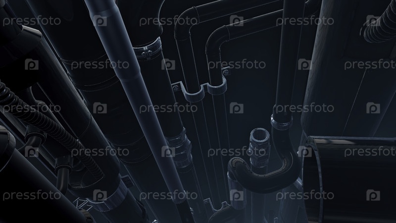 3D-анимация с трубопроводом. Движение. Движение по канализации или промышленным экскурсиям. Множество различных труб на стенах канала