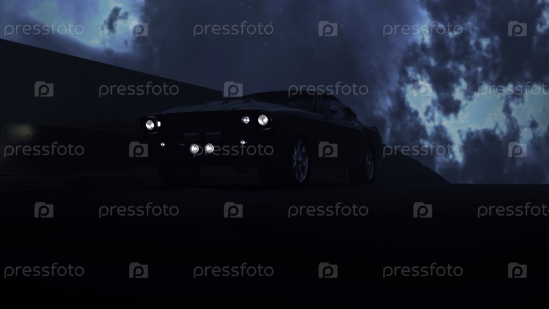 Серый и синий фоновый свет. Дизайн.Темный фон с модным иностранным автомобилем, созданным в анимации с движущимися колесами и асфальтом и облаками со светом. Высокое качество 4k кадры