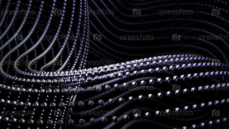 Абстрактная сложная форма небольших металлических шаров на черном фоне. Дизайн. Сгибающаяся 3D-фигура крошечных частиц
