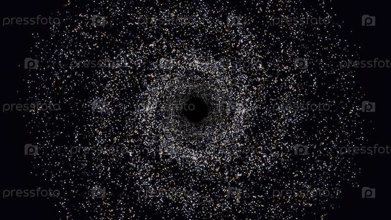 Блестящие золотые частицы плавают, вращаются по спиральной траектории и распространяются на черном фоне.Абстрактное облако небольших кругов образует космический туннель